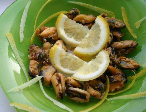 Прожарила мидии в раскаленном масле с чесночком и солью 3 минуты, перед обжаркой "запанировала" в кунжуте. Перед подачей обильно сбрызнула соком лимона. Говорит, что ОЧЕНЬ вкусно
