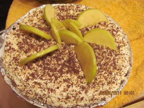 Торт украсить взбитыми сливками, дольками яблока и кусочками шоколада.