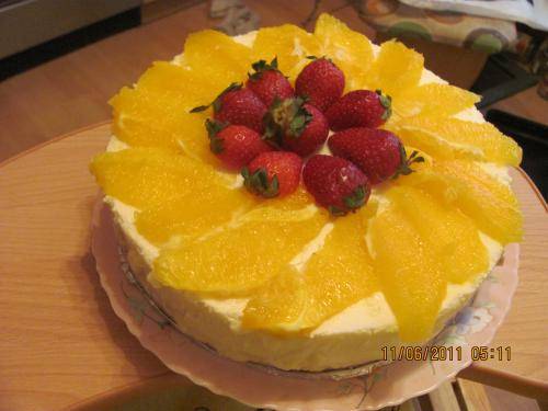 Сверху залить кремом. Поставить в холодильник на 10 часов. Украсить взбитыми сливками и дольками апельсина