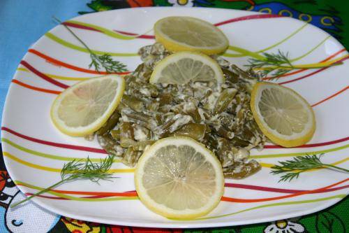 Стручковую фасоль не размораживая слегка обжарить на сухой сковороде, чтобы избавиться от лишней жидкости, добавить соль, мелко порубленный чеснок, сливки и все вместе протушить под крышкой до готовности. Фасоль должна стать мягкой и практически полностью впитать сливки. В конце приготовления обязательно добавить сок лимона, перемешать.