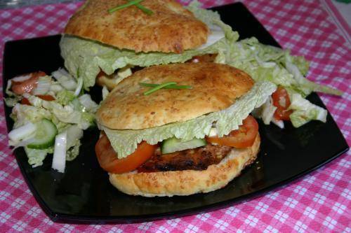 Вряд ли такой гамбургер можно считать страшно вредным, если самим сделать куриные котлетки, испечь булочки, не добавлять кетчуп и майонез + добавить много-много овощей